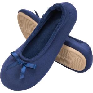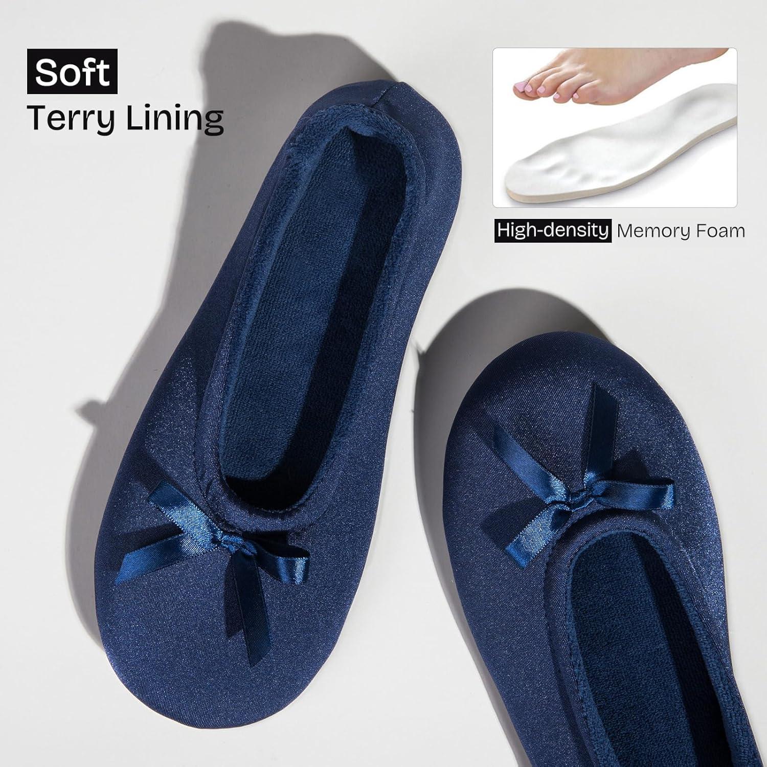 EverFoams Women’s Satin Memory Foam Ballerina Slippers Cute House Shoes with Indoor Rubber Sole(Navy Blue)