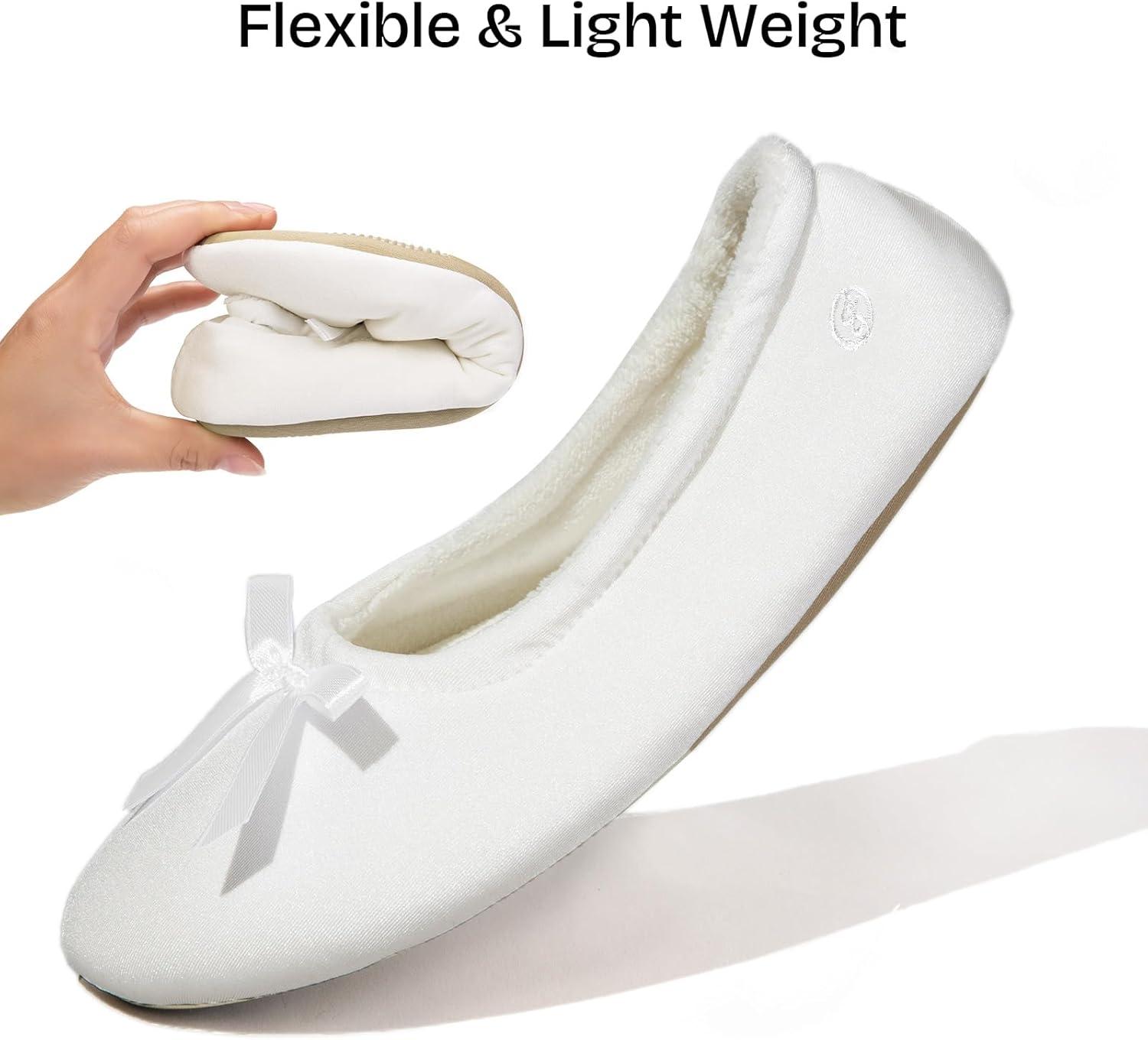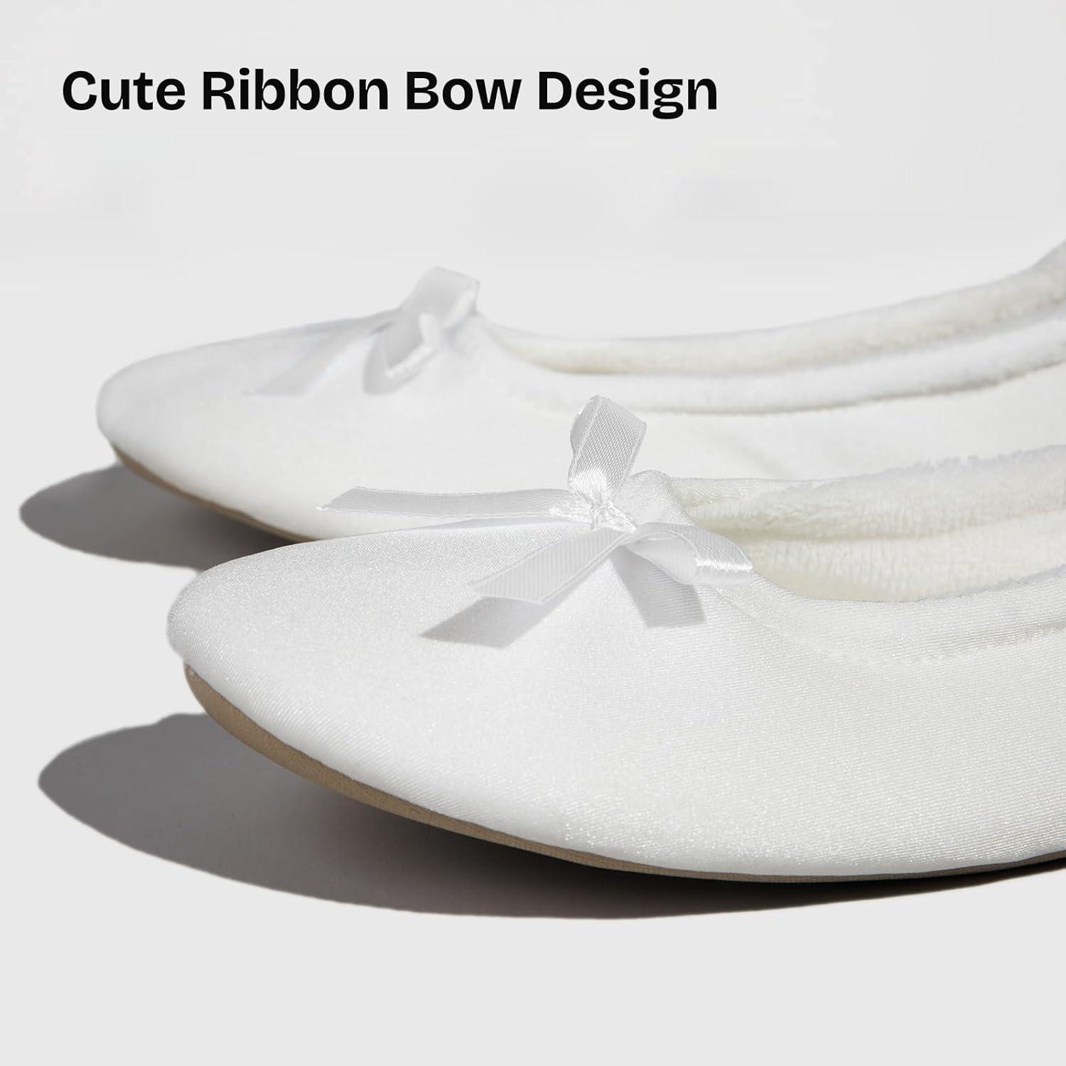 EverFoams Women’s Satin Memory Foam Ballerina Slippers Cute House Shoes with Indoor Rubber Sole(White)