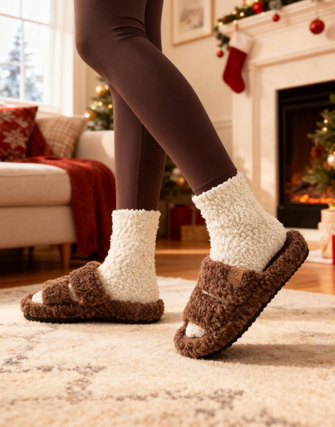 EverFoams Women’s Winer Slipper Socks Set – Women’s Microsuede Slippers (Size 9-10, Tan) – Cozy Chenille Socks 3-Pair Set (Free Size, Cute Girly)