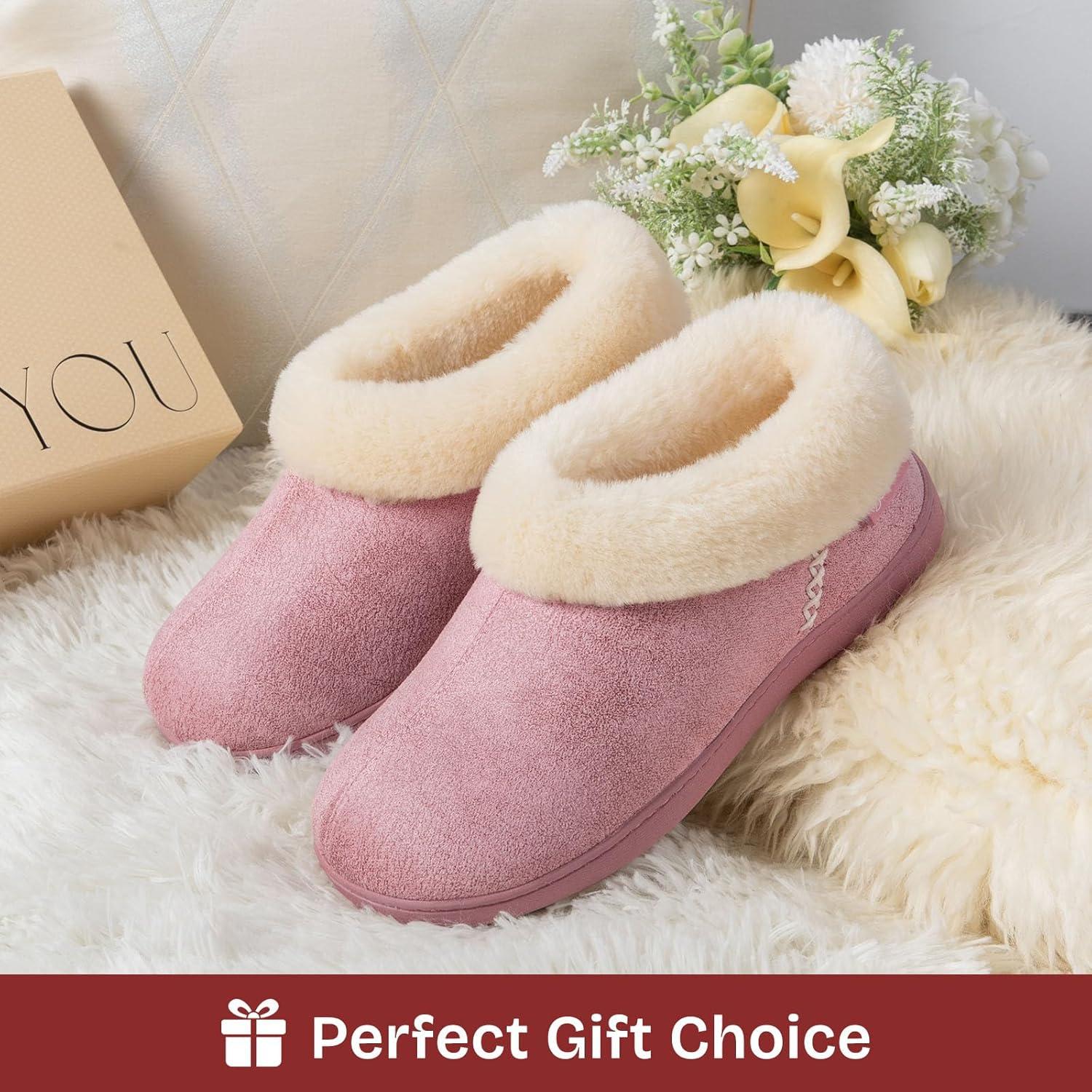 EverFoams Women’s Microsuede Cozy Memory Foam Winter Slippers with Fuzzy Faux Fur Collar and Indoor Outdoor Rubber Sole(Baby Pink)