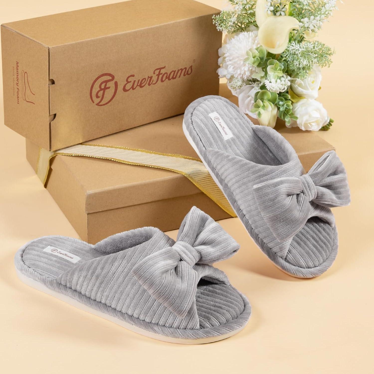 EverFoams Women’s Open-Toe Bow Slippers with Memory Foam Indoor House Non-Slip Sole(Ultimate Gray)